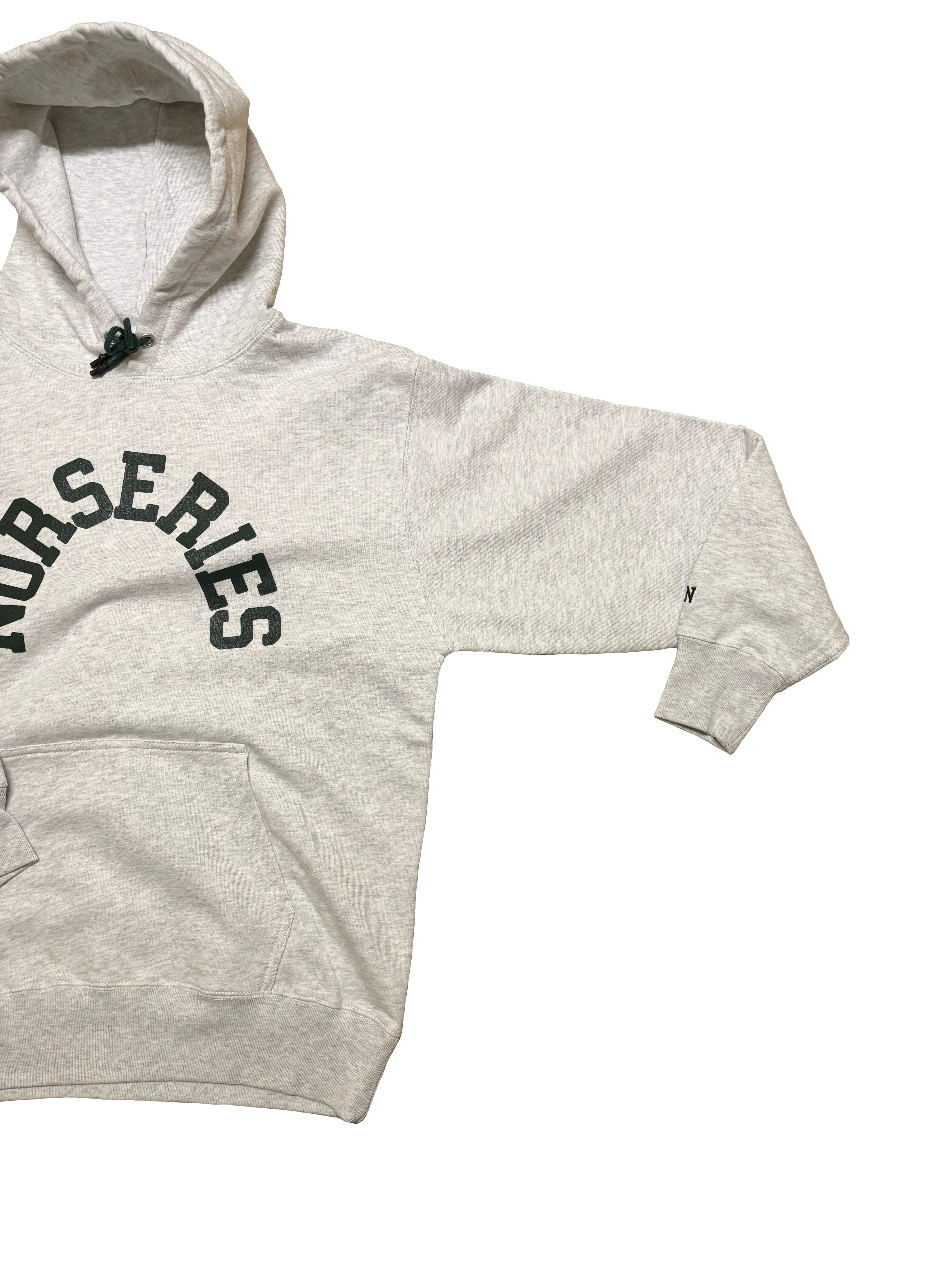 アッシュグレーのボディフロントにはダークグリーンカラーでインパクトを効かせた大きめののNURSERIESの文字がプリント。