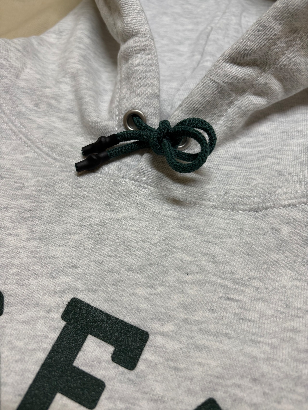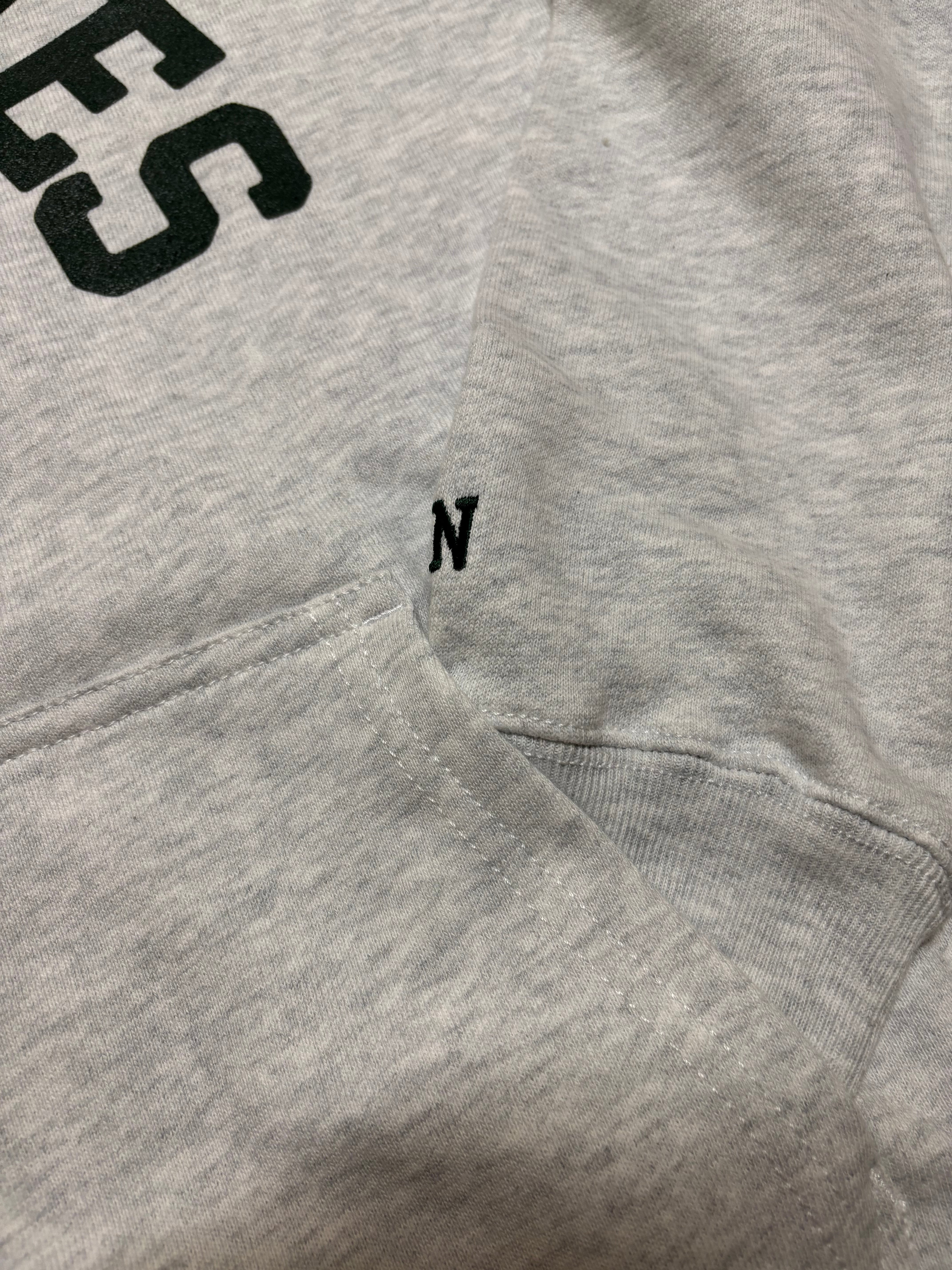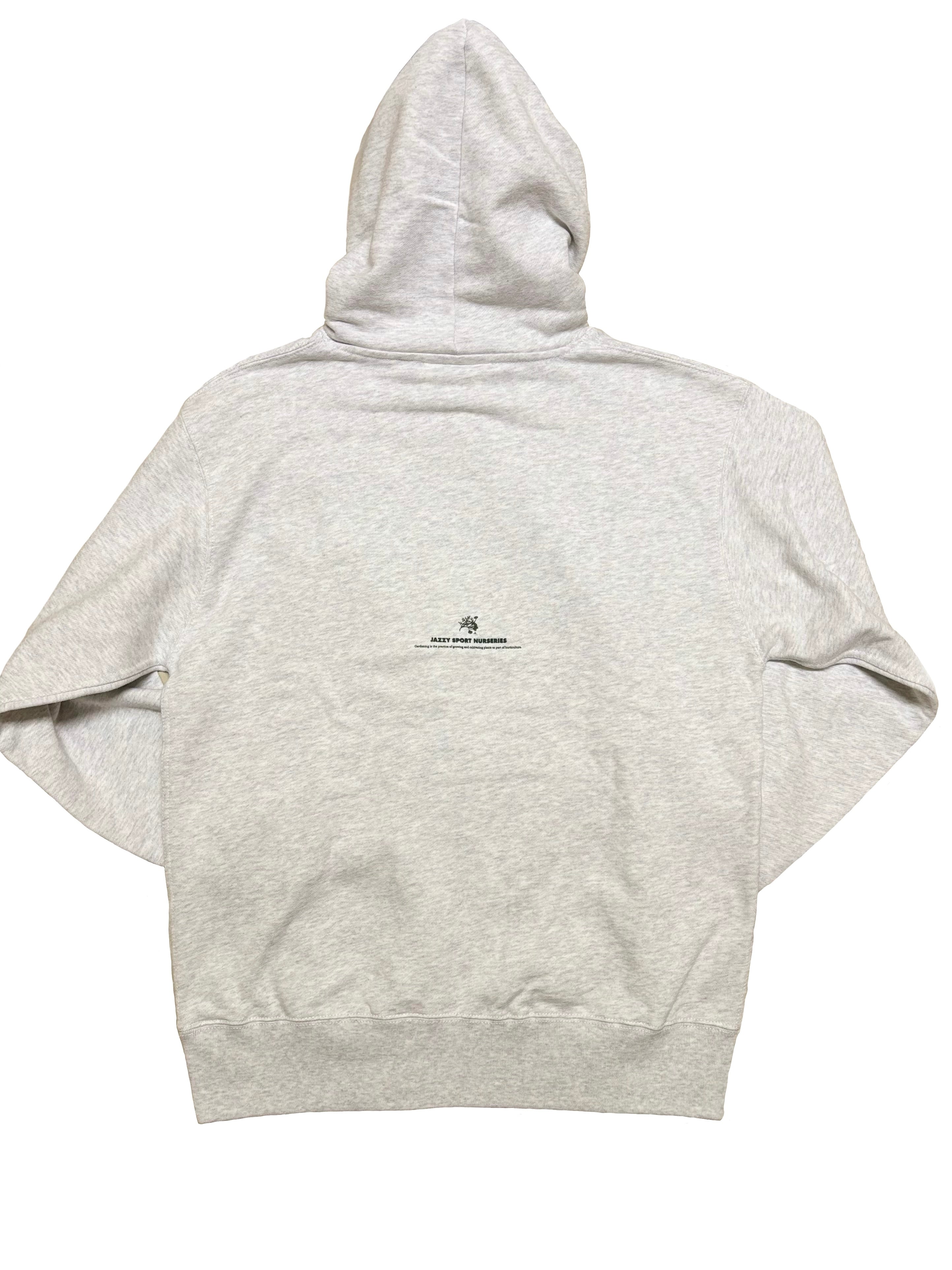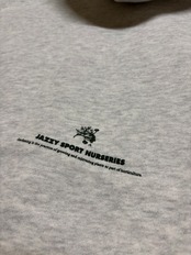 バックにはさりげなく可愛いらしいサイズでジャジースポートナーセリーズのロゴがプリントしてあります。また袖山にはナーセリーズを表す "N" の刺繍が入っており、日常使いのなかにも高級感を得られるデザインになっています。プリント、刺繍、フードの紐を全てダークグリーンで統一し、JSナーセリーズらしい緑をライフスタイルに取り入れたデザインとなっています。